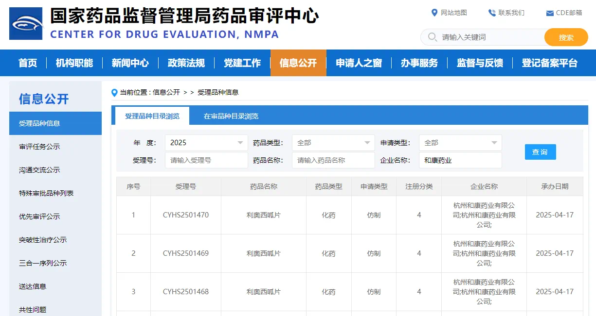 4月17日,国家药品监督管理局药品审评中心(CDE)发布公告,杭州和康药业有限公司提交的【利奥西呱片】药品注册申请获受理,受理号:CYHS2501468 / CYHS2501469 / CYHS2501470。