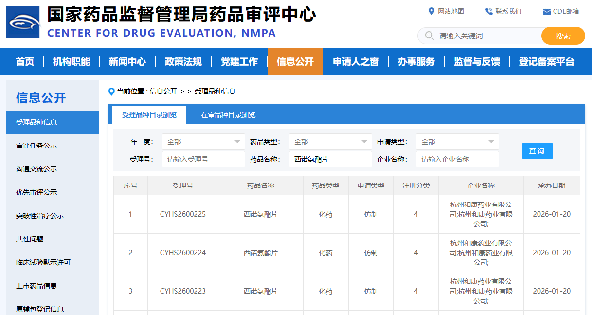 1月20日,国家药品监督管理局药品审评中心(CDE)发布公告,杭州和康药业有限公司提交的【西诺氨酯片】药品注册申请获受理,受理号:【 CYHS2600223 】【 CYHS2600224 】【 CYHS2600225 】